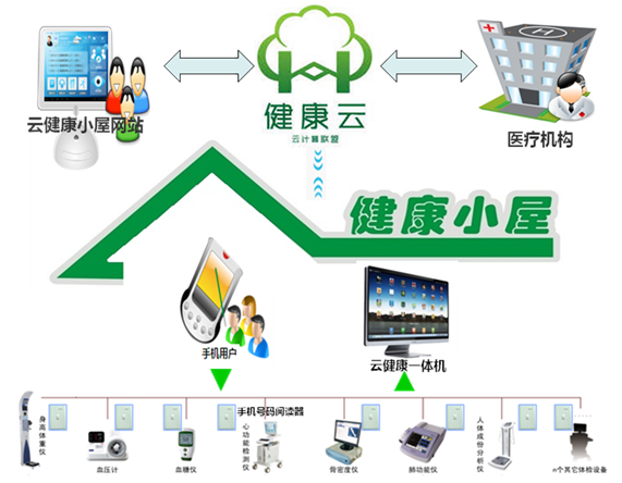 以自主健康一体机为核心设备,将N个医疗设备整合,引入云健康小屋数据自动采集技术、专家系统技术和数据管理技术,对人体的血压、血糖、身高、体重等进行测试,获得包括基础代谢、BMI值,危险因素等人体检测信号,通过个人信息采集系统、专家测评系统、自助建档生成系统、后台管理系统,自动作出健康评价报告和慢病指导方案,并建立健康档案。