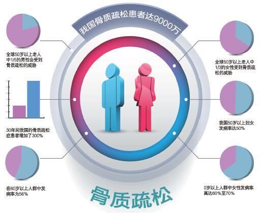 据国际骨质疏松基金会的统计数据显示,骨质疏松症目前危害着全球大约三分之一50岁以上的女性和五分之一50岁以上的男性。60岁以上的人群中发病率高达56%,其中女性更高达60%~70%;相当于每2个60岁以上老人中就有1个骨质疏松患者。