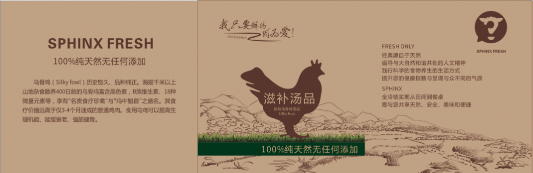中国思粉客思(CHINA SPHINX)作为中国食疗养生鲜食领导品牌,秉承中医经典文化国粹,不仅要给生命以岁月,更要给岁月以生命。专业团队心无旁骛、执念品类、磨砺技艺、专注极致。优选原生态、源头采购、产地监制,100%纯天然无任何添加,结合现代科技实现从源头到餐桌全程冷链。从食材、水质到中央厨房系统都确保了独味如一,初心不改。