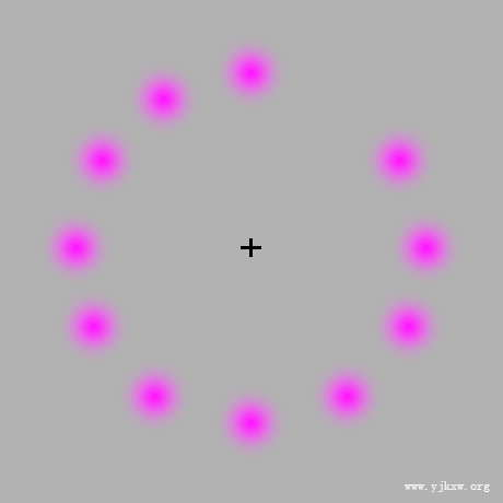 一定要聚精会神地盯着中央的十字看,你会发现,周围紫色的圆点渐渐淡下来,甚至消失。最后只剩下一个绿色的圆点在那里转!