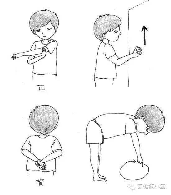 手指爬墙。患者面对墙壁站立,用患侧手指沿墙缓缓向上爬动,使上肢尽量高举,到最大限度停留2到6秒。在墙上作一记号,然后再徐徐向下回原处,反复进行,逐渐增加高度。
