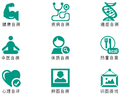 进入该检测区后,无须注册,即可免费在自主健康检测区进行健康自测、疾病自测、癌症自测、中医自测、体质自测、热量自查、心理自评、辨图自测、识图游戏等体验。见下图: