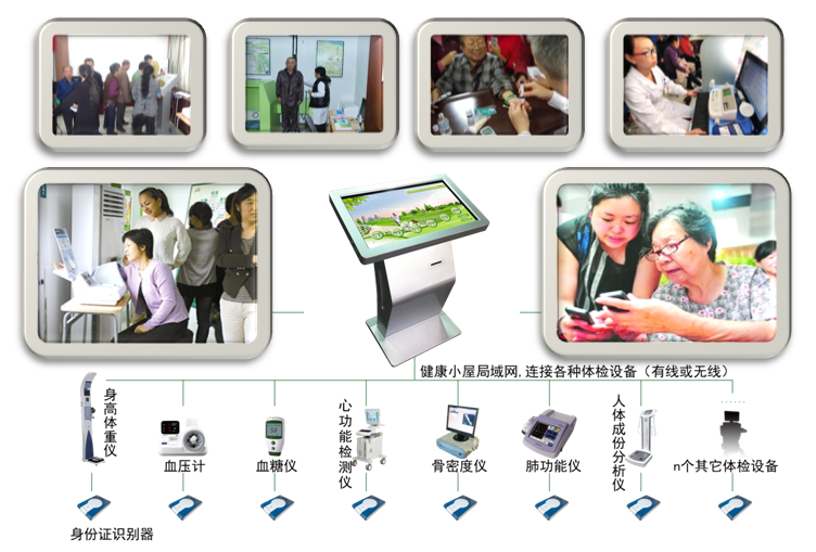 就是你直接到线下的实体机构进行健康管理,通过自助健康一体机、身高仪、体重仪、血压仪、肺功能仪、心血管检测仪、骨密度检测仪、心电图、血糖监测仪等设备进行检测,进行建档、复诊、随访,并将你的检测数据及管理信息发送到云端数据库,通过云计算、云评估、云应用,达到健康管理的目的。