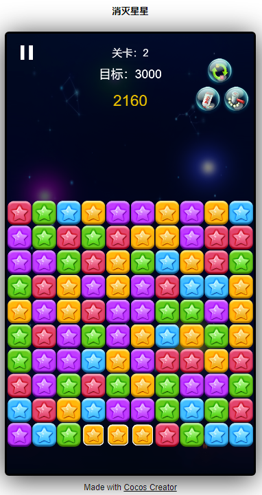 一款经典的消除类游戏,相邻两个或两个以上元素块才可消除,内置了“刷新”、“木锤”、“画笔”等道具,刷新:所有元素块随机刷新位置,木锤:消除选中的元素块,画笔:更改选中元素块颜色