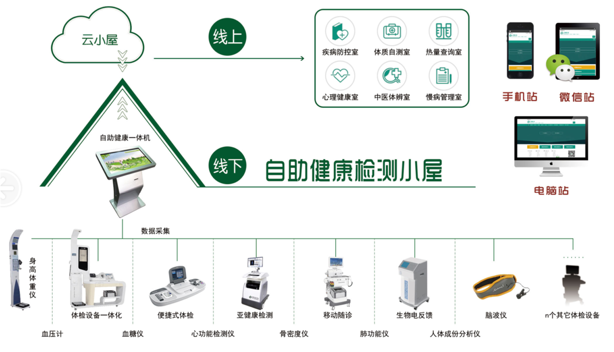 它是在传统健康小屋的基础上研发出的3.0版健康小屋,它发扬了传统健康小屋的优势,克服了不足,拓展了新的功能。集网上、网下、互联为一体;融宣教、检测、指导为一炉。形成以建立覆盖所辖范围的健康管理服务体系为目标,以搭建线上线下二个对外服务的窗口为手段,以云计算、云存储、云应用、云物联为核心技术,以构筑慢病自助检测系统、心理量表测评系统、中医体质辨识系统、老年人中医药健康管理系统、营养医学管理系统、网上家医签约服务系统、个人健康档案管理系统、健康管理服务系统等服务功能为支撑,以健康一体机、身高体重秤、智能血压计、血糖监测仪、人体成份仪、骨密度仪、肺功能仪、心电图机、心肺功能仪等N个检测设备为采集载体行使健康管理服务功能,努力探索以互联网为基础的机构与机构,机构与人的健康管理运行机制,同时通过居民群众的积极参与,改变不良生活习惯,逐步形成现代人的健康生活方式,提高居民健康水平,达到人人健康的目的。见下图: