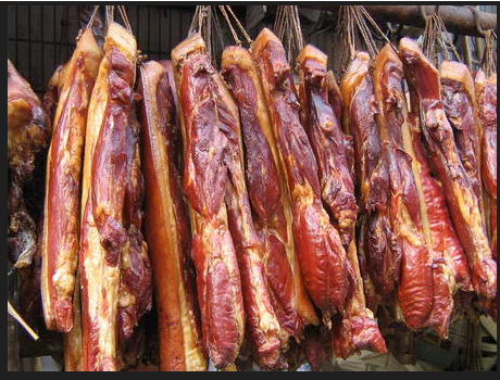 肉块的刀工整齐,长短一致,宽度和厚度均匀,表面无盐霜,肉身干爽,肉质光洁结实,有弹性,肥肉金黄透明,瘦肉鲜红或暗红色,皮坚硬呈棕红色,咸度适中,气味芬芳。