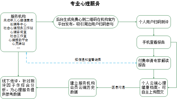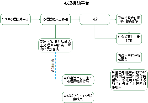 5) 心理检测法:是评估方法中最重要、最直接、最方便的测评工具,例如通过“心云通”,选择人格量表、智力量表、症状量表等等的测试,可获得较高可信度的量化记录。心云通具体应用流程见下图: